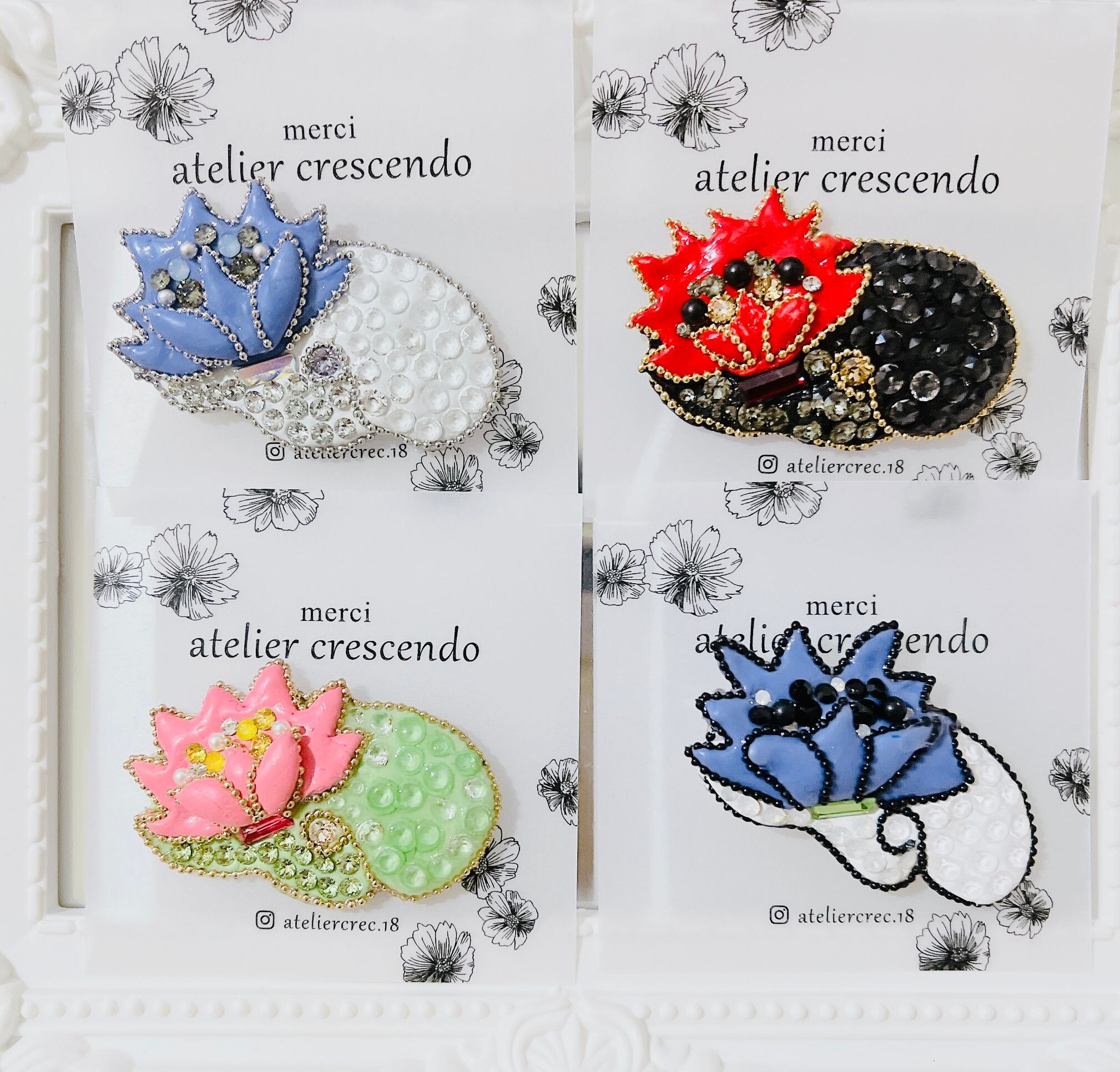 「lotus D 蓮の花ブローチ」。日本の技術とアートを結集し、水辺に浮かぶ美しい蓮の花を表現しました。Swarovski社のクリスタルを用い、ルージュノアール(赤黒)、サクラペリドット、タンザナイトグレーの美しいカラーバリエーションをご用意しました。ブローチピンタイプとマグネットタイプの2つのタイプをお選びいただけます。いつものファッションにアクセントを加え、魅力的な存在感を放つ「lotus D 蓮の花ブローチ」。Japan Expo paris2023出展作品です。どんなシチュエーションでもスタイリングのポイントになるアイテムで、あなたの個性を引き立てましょう!使い方によっては、バックや帽子、ストールのアクセサリーとしてもお使いいただけます。心を豊かに彩るアートピースをぜひお試しください。